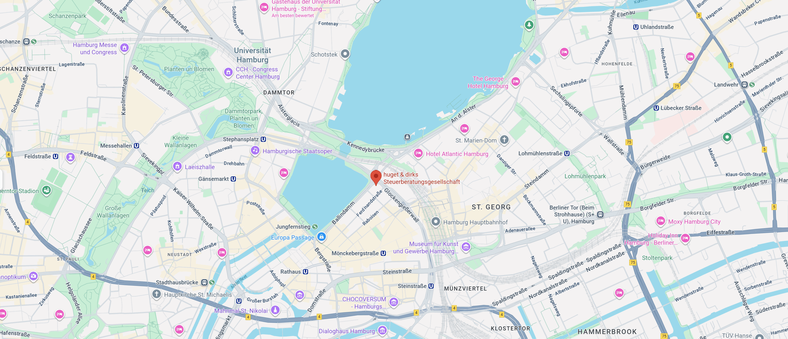Mit dem Auto erreichen Sie unsere Räumlichkeiten über den Glockengießerwall / Lombardsbrücke. Eine Wegbeschreibung via Google Maps finden Sie hier.